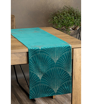 Față de masă din catifea turcoaz închis cu motive aurii 35x180 cm