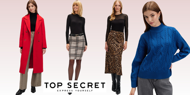 Îmbrăcăminte pentru femei marca Top Secret - diverse modele de paltoane, bluze, jachete, sacouri, fuste, pantaloni și multe altele într-o gamă de culori și mărimi actuale pentru fiecare siluetă.