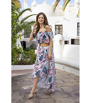 Fustă lungă asimetrică în culori predominant roz și albastru, Patty