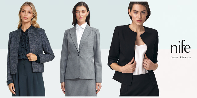 Brandul european Nife prezintă o vânzare de haine elegante pentru femei - fuste, bluze, cămăși, jachete, rochii, body-uri, salopete, hanorace, topuri și multe altele în culori proaspete. Mărimi de la 36 la 44. Actualizează-ți garderoba cu ceva elegant din colecția Nife la reducere!