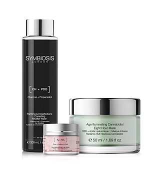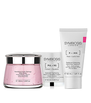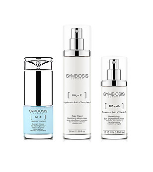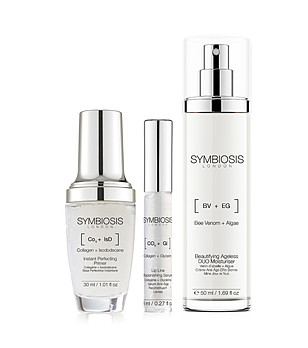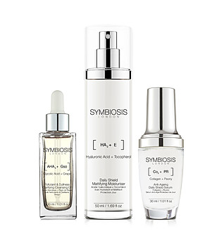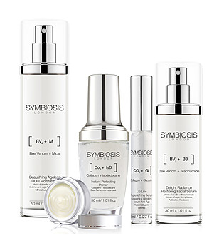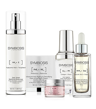Varietatea de seruri, creme, exfoliante, măști și creme hidratante Symbiosis, îmbogățite cu acid hialuronic, ingrediente anti-îmbătrânire, antioxidanți, colagen, venin de albine și multe altele.