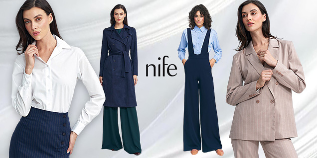Brandul european Nife prezintă o vânzare de îmbrăcăminte elegantă pentru femei - fuste, pantaloni, bluze, cămăși, body, salopete, jachete, rochii, topuri, paltoane, jachete, veste și pulovere în culori proaspete. Mărimi de la 34 la 44. Actualizați-vă garderoba cu ceva stilat din colecția de reduceri a Nife!