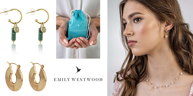 Bijuterii pentru femei de la Emily Westwood - o varietate de brățări, inele, cercei și coliere. Modelele cu o varietate de modele în auriu și argintiu vor fi accentul perfect pentru un aspect mai glamouros.