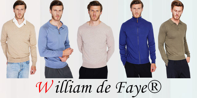 Pulovere, cardigane, jachete, accesorii bărbătești cu marca William de Faye - diverse modele într-o gamă de culori actuală și țesături care conțin fibre naturale precum lână, cașmir și bumbac.