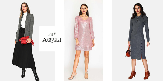 Rochii și cardigane cu marca Assuili - diverse modele, țesături care conțin materiale naturale.