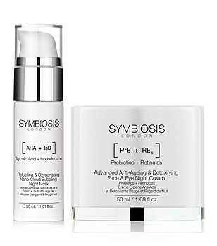 Varietatea de seruri, creme, exfoliante, măști și creme hidratante Symbiosis, îmbogățite cu acid hialuronic, ingrediente anti-îmbătrânire, antioxidanți, colagen, venin de albine și multe altele.