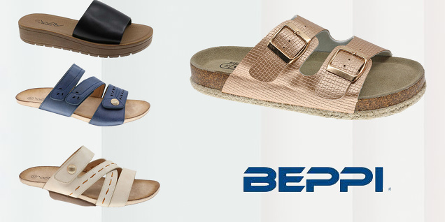 Beppi prezintă papuci pentru femei și bărbați în diverse modele și culori. Modele cu platformă sau talpă plată. Mărimi până la 45.