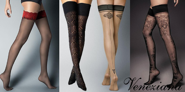 Colecție de șosete lungi de la Veneziana. Modele cu bordură din silicon, pentru portjartier sau până sub genunchi.