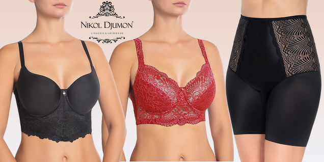 Alege lenjeria intimă clasică neagră și roșie de la marca Nikol Djumon. O varietate de sutiene, bikini, boxeri, colanți și brâuri.