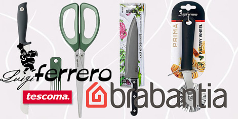 Cuțite, curățătoare de frunze și felioare de la mărcile Brabantia, Luigi Ferrero, Muhler și Tescoma pentru a tăia cu ușurință și precizie.