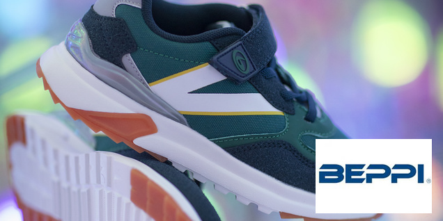 Beppi prezintă o selecție de pantofi sport pentru copii, în mărimi de la mărimea 16 pentru bebeluși până la mărimea 43 pentru tineri.