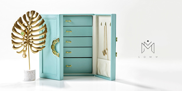 Cutii de bijuterii cu marca Somm, design non-standard, gamă de culori actuală, detalii metalice și accente din piele întoarsă și piele.