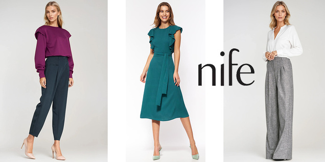 Brandul european Nife prezintă o vânzare de haine elegante pentru femei - fuste, bluze, cămăși, jachete, rochii, body-uri, salopete, hanorace, topuri și multe altele în culori proaspete. Mărimi de la 36 la 44. Actualizează-ți garderoba cu ceva elegant din colecția Nife la reducere!