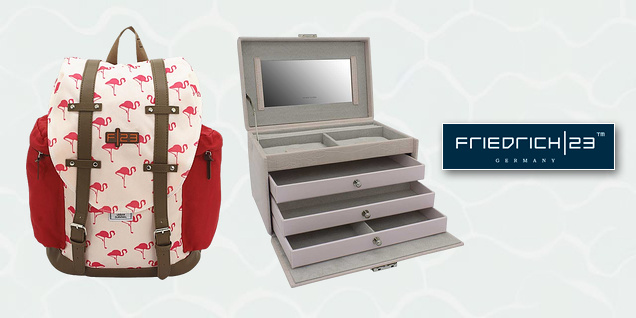 O selecție de rucsacuri, genți, truse de toaletă, portofele, cutii de bijuterii și multe altele de la brandul european Friedrich 23 și liniile sale Olomolo, Toito wear, Bond Street și multe altele. Fie că mergeți la cumpărături, într-o călătorie de afaceri sau pur și simplu în vacanță, puteți avea întotdeauna încredere în produsele Friedrich 23 - sinonime cu fiabilitatea și caracterul practic. Profitați acum!