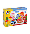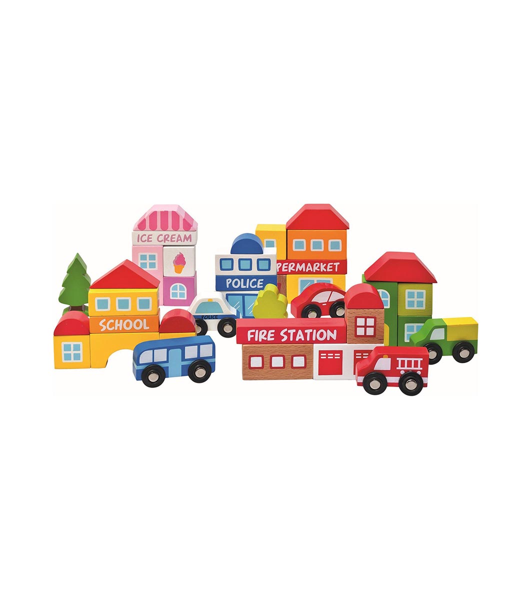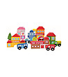 Accesoriu de cale ferată „Oraș“ - un set cu elemente colorate, realizate din lemn masiv, cu care copilul poate construi clădiri diferite - incendiu, școală, secția de poliție, supermarket și gelateria, și mai multe elemente suplimentare importante pentru orice oras - 5 automobile și 2 copaci - 39 părți.