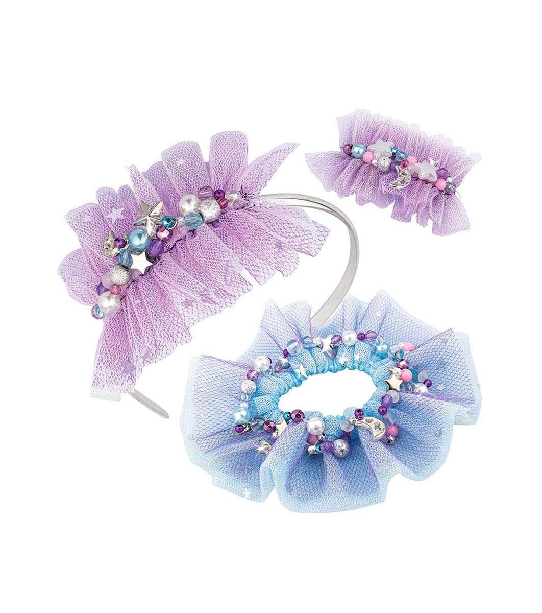 Cu acest set, prințesa ta va avea ocazia să-și creeze propriile accesorii de păr pentru a face coafuri frumoase. Va avea ocazia să se distreze făcând ornamente, pe care apoi le va purta cu plăcere.