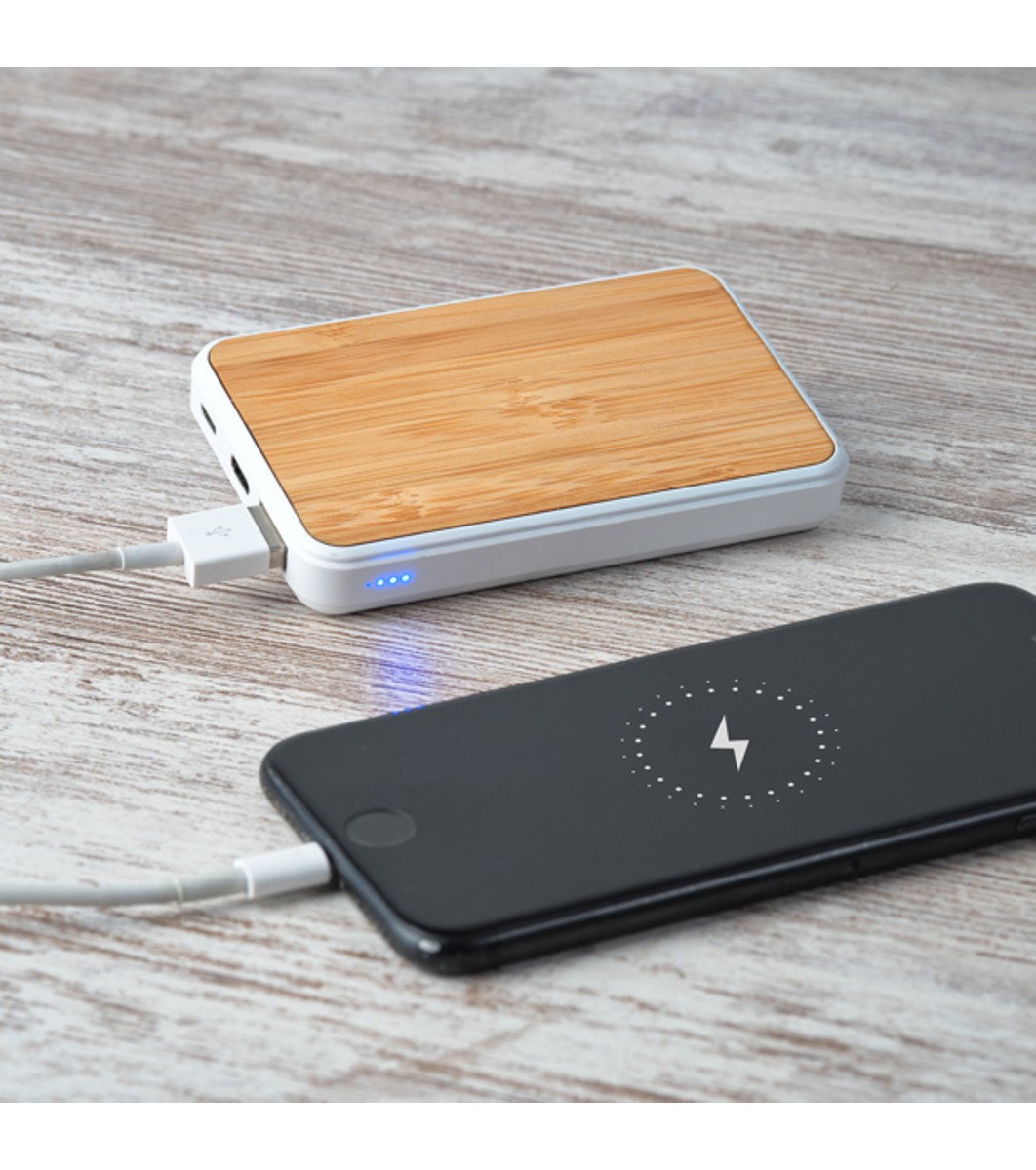 Baterie externă 5000 mAh, cu corp dreptunghiular din ABS alb și suprafață din bambus.