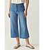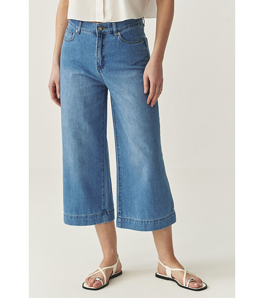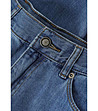 Blugi cu croială lată și dreaptă până la gambă. Închidere cu fermoar și nasturi metalici în față. Curea cu găici pentru curea. Model cu cinci buzunare, două buzunare față și două buzunare spate. Tiv cu cusătură suplimentară în partea de jos a piciorului.
