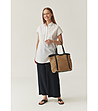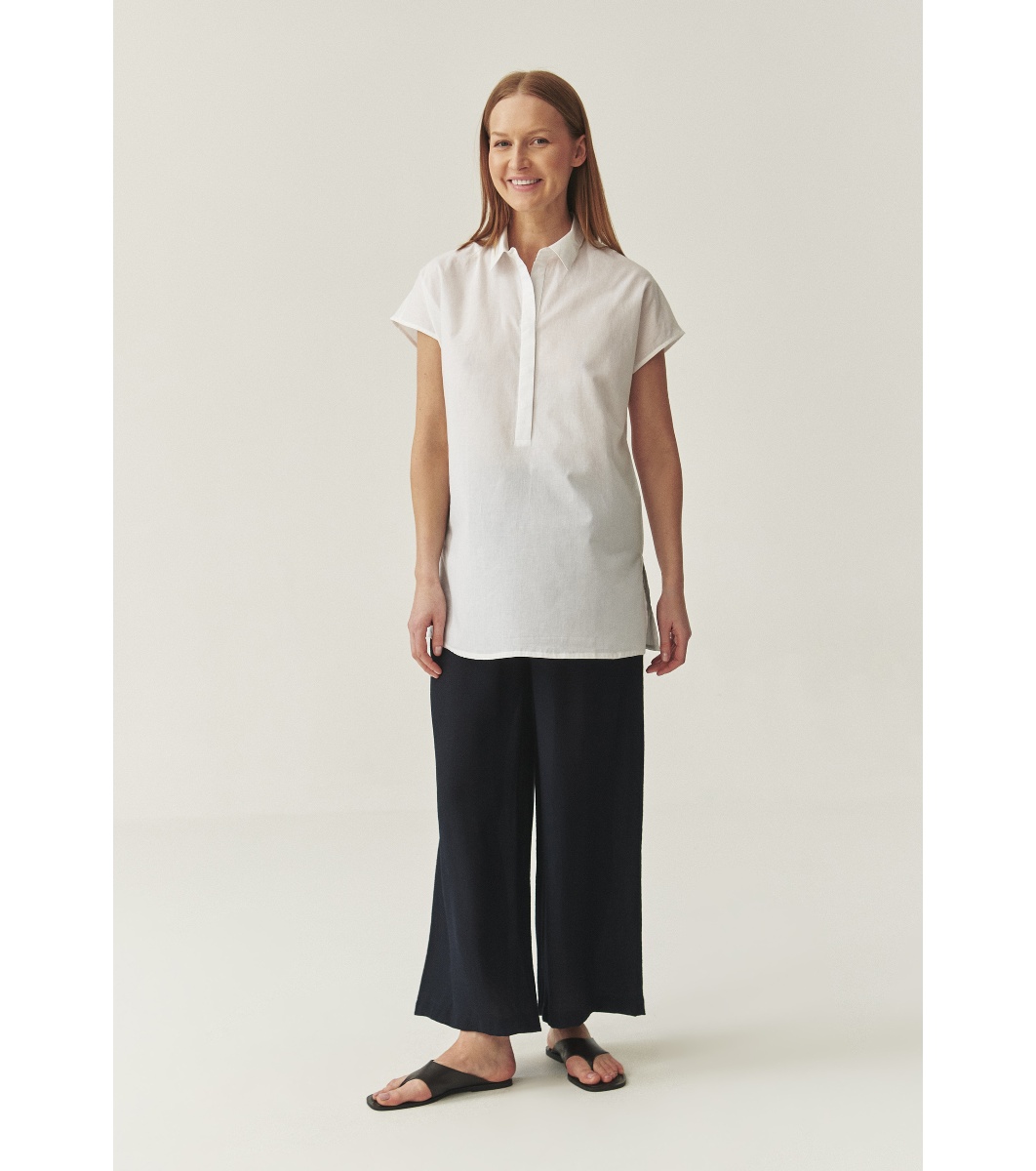 Bluză dreaptă, tip tunică, cu lungime sub șolduri. Guler clasic și mâneci scurte. Închidere frontală cu fermoar ascuns sau nasturi în partea de sus. Spate curat, fără detalii suplimentare.