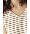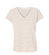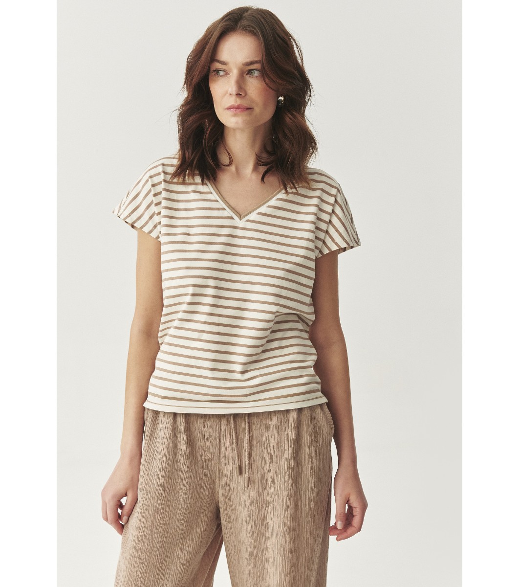 Modelul are o croială dreaptă și dungi orizontale.