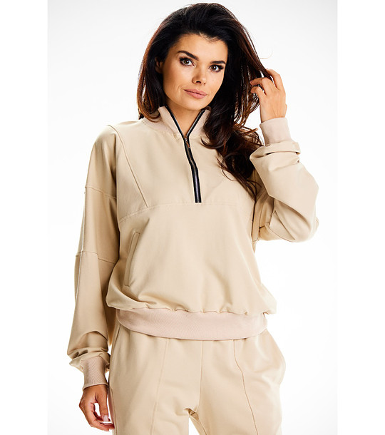 Infinite you Bluză bej din bumbac pentru femei Guler înalt cu fermoar