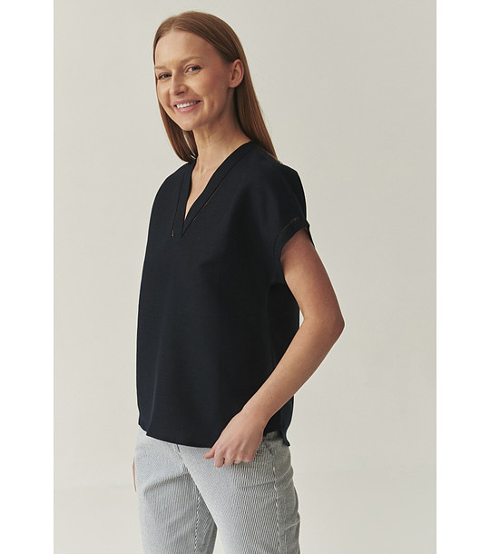 Tatuum Bluză bleumarin cu decolteu în V Siluetă dreaptă cu umăr căzut. Decolteu în V cu benzi decorative ajurate. Mâneci scurte cu tiv și detaliu ajurat. Material neted cu o structură ușoară. Tiv drept cu o ușoară curbură. Haine 966829 Preţ normal: 382.01 lei 142.57 (Colecţia se încheie la ) Cumpăraţi de pe: FashionSupreme.ro Cumpără acum!