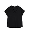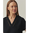 Siluetă dreaptă cu umăr căzut. Decolteu în V cu benzi decorative ajurate. Mâneci scurte cu tiv și detaliu ajurat. Material neted cu o structură ușoară. Tiv drept cu o ușoară curbură.