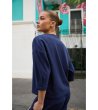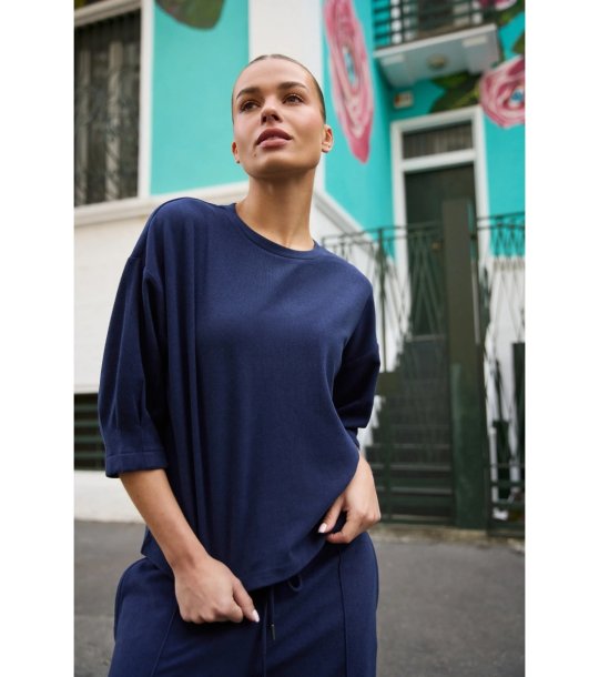Bluză dreaptă de damă cu decolteu rotund și mâneci 3/4. Umeri căzuți și croială ușor lejeră. Design curat, fără elemente suplimentare.