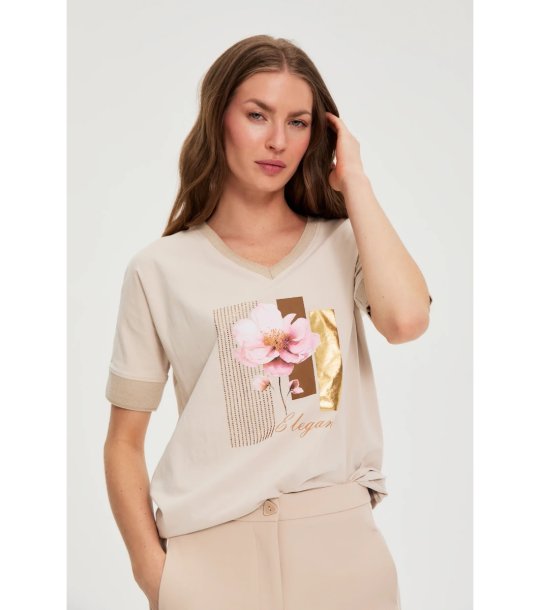 Moodo Bluză de damă bej din bumbac cu imprimeu Decolteu în V