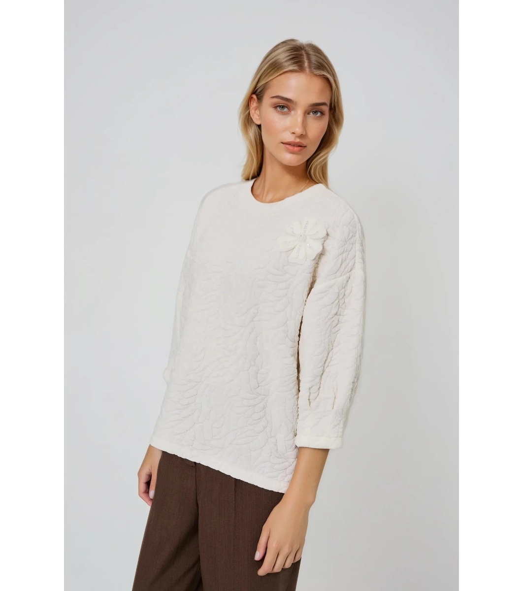 Moodo Bluză de damă ecru cu relief și floare Bluză de damă cu croială dreaptă și decolteu rotund