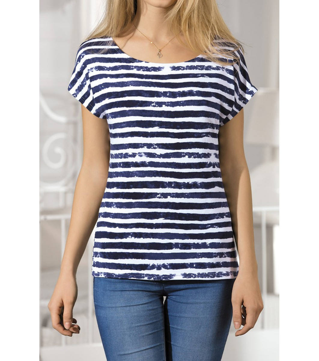 Babell Bluză de damă în dungi albastru închis Jovana Bluză de damă cu croială dreaptă și mâneci scurte cu umăr căzut.