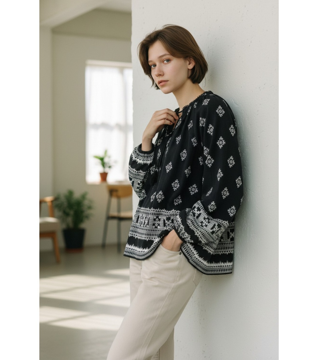 Assuili Bluză neagră cu imprimeu și broderie NOIR Croială lejeră cu mâneci lungi.