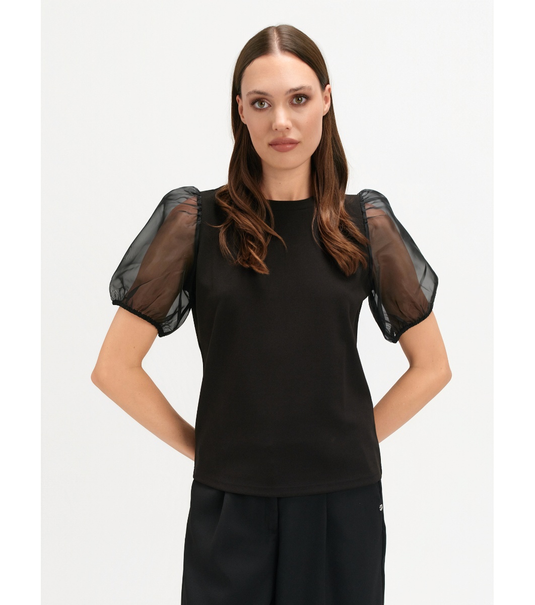 Bluză neagră cu mâneci bufante transparente