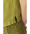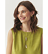 Bluză de damă fără mâneci, cu croială dreaptă. Decolteu rotund. Tiv drept cu șlițuri laterale scurte. Material neted cu textură fină.