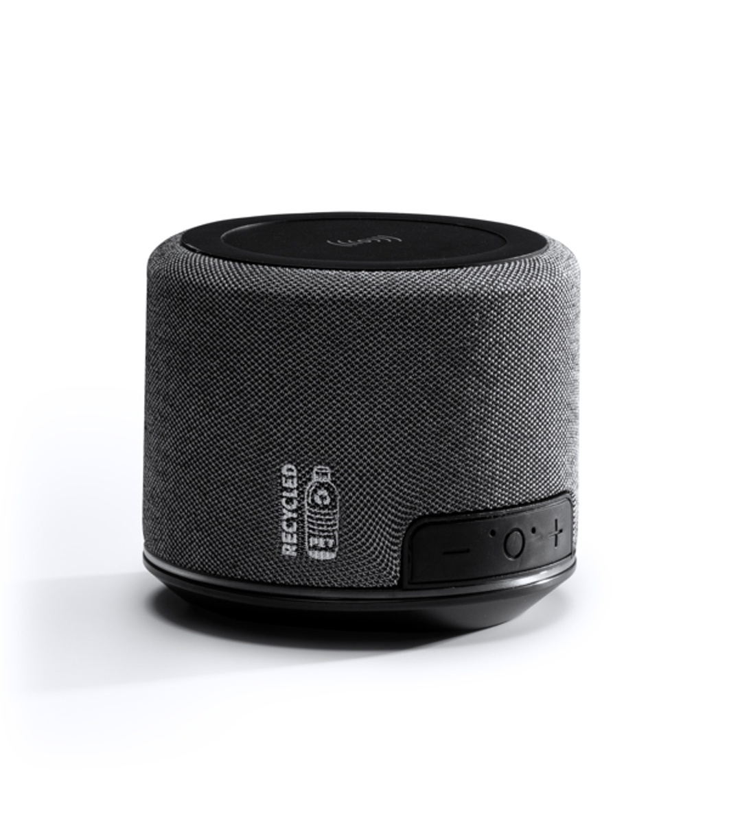 Boxă wireless fabricată din țesătură de poliester reciclat RPET cu stație de andocare wireless de 5W.