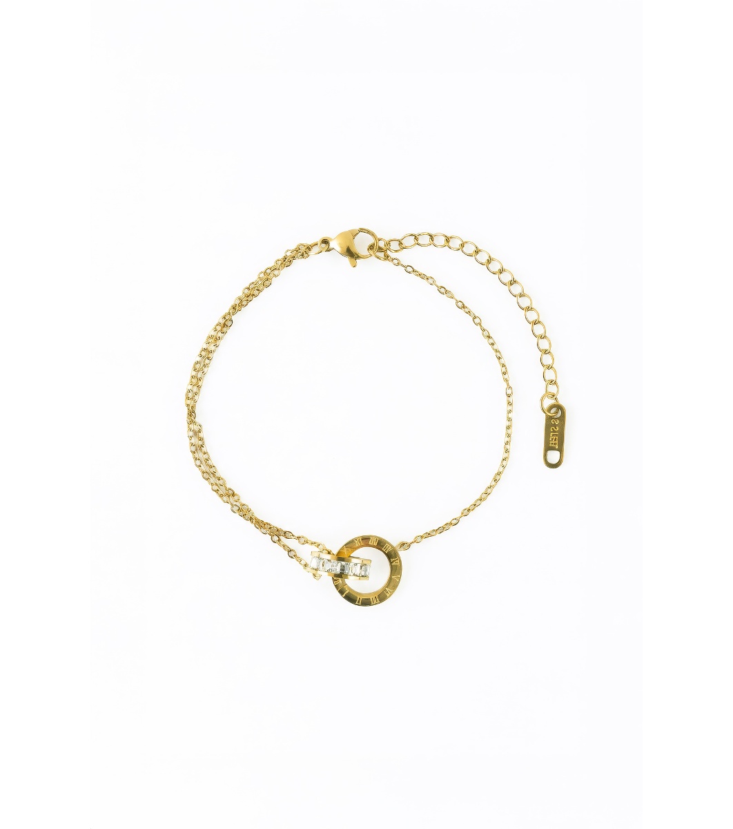Brățară aurie de damă cu pandantiv rotund și pietre transparente