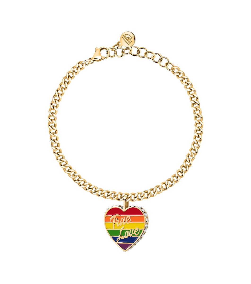 Pandant în formă de inimă cu dungi emailate colorate și inscripția „True Love” (Iubire adevărată)