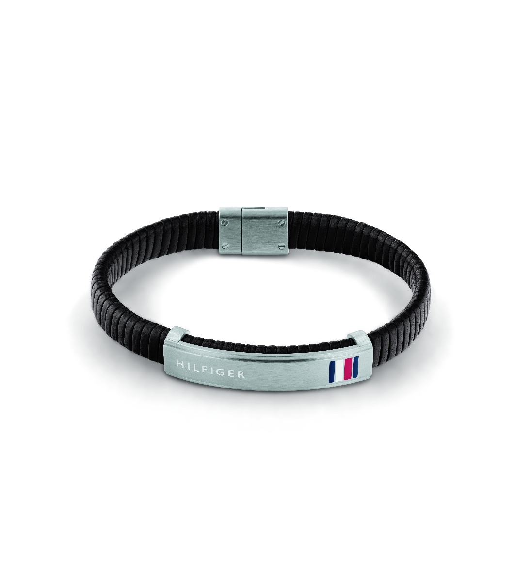 Tommy Hilfiger Brățară bărbătească din piele neagră TOMMY HILFIGER cu placă metalică Brățară bărbătească