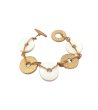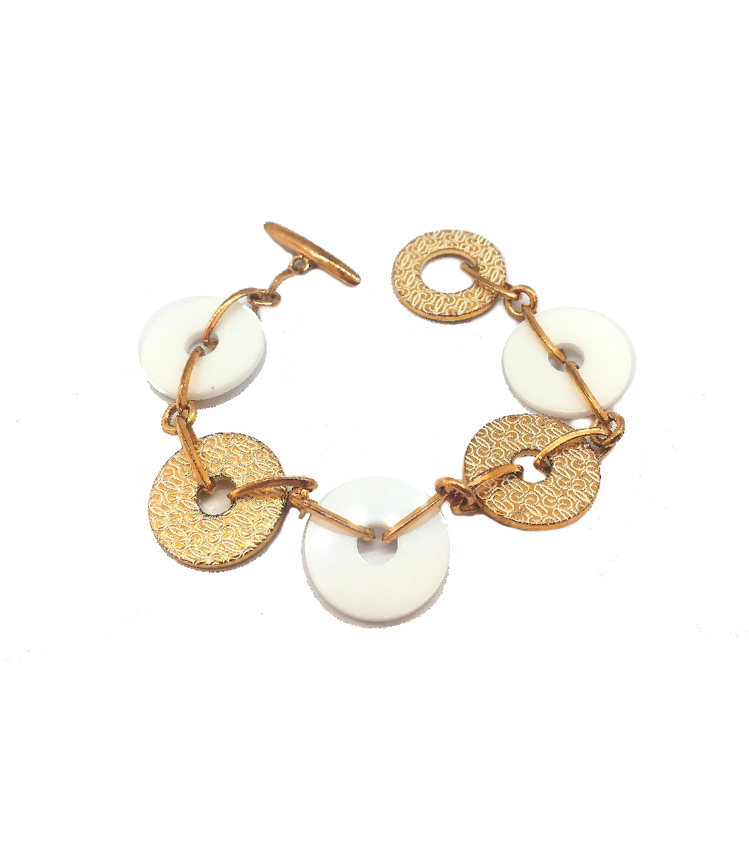 Brățară elegantă, combinând diverse elemente într-o formă rotundă.
