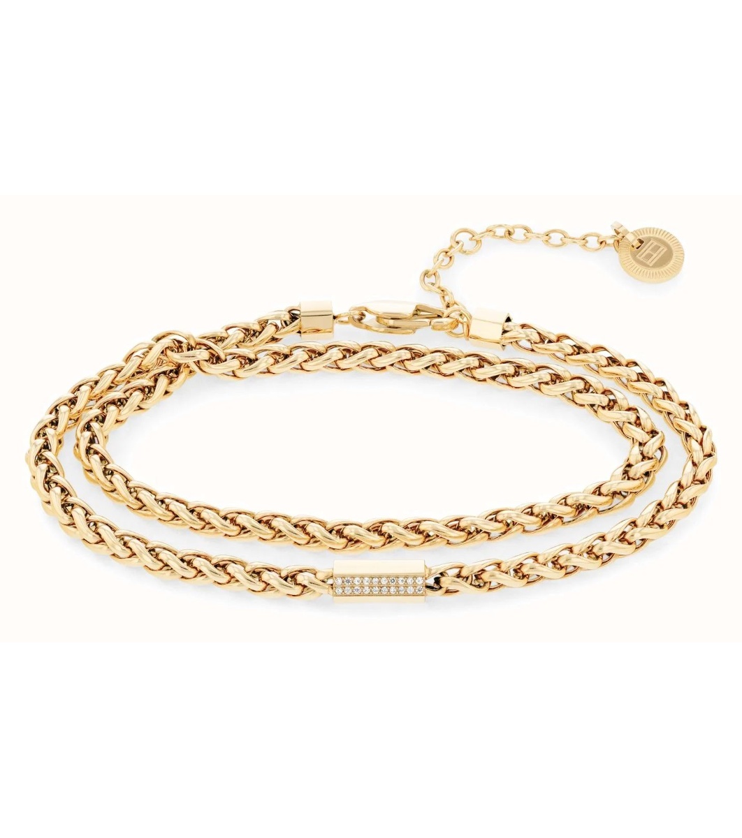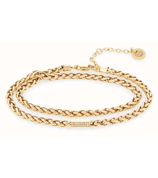 O brățară sofisticată cu lanț împletit, care se termină cu o carabină pentru o fixare ușoară. Un accent detaliat cu mici elemente decorative adaugă un plus de strălucire.