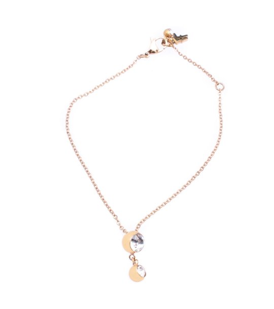 Brățară elegantă cu lanț subțire și două pandantive rotunde. Un pandantiv are un element strălucitor, iar celălalt este mai mic și neted. Închizătoarea este de tip carabină.