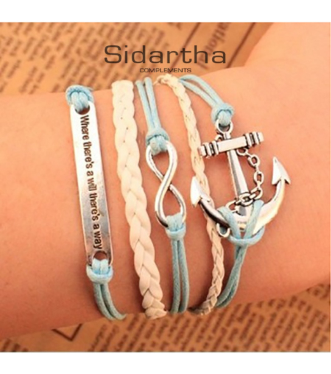 Sidartha Brățară de damă în albastru deschis și alb cu motive marine în argintiu Brățară spectaculoasă din piele și șnur cu elemente metalice cu cristale