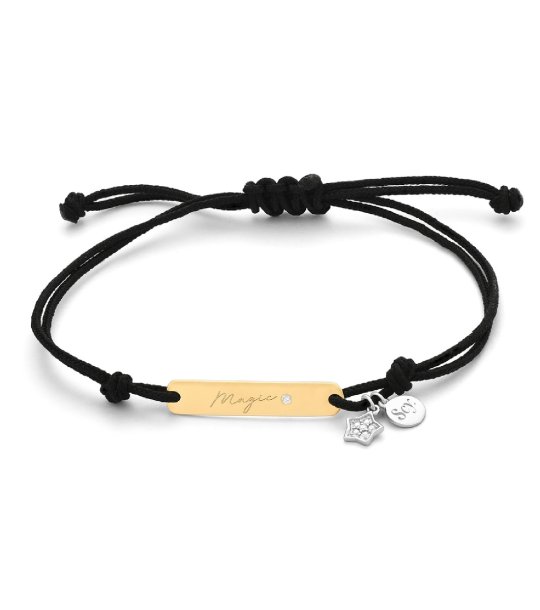 Brățară cu încuietoare reglabilă și elemente decorative. Există o placă metalică cu inscripție și pandantive suplimentare.