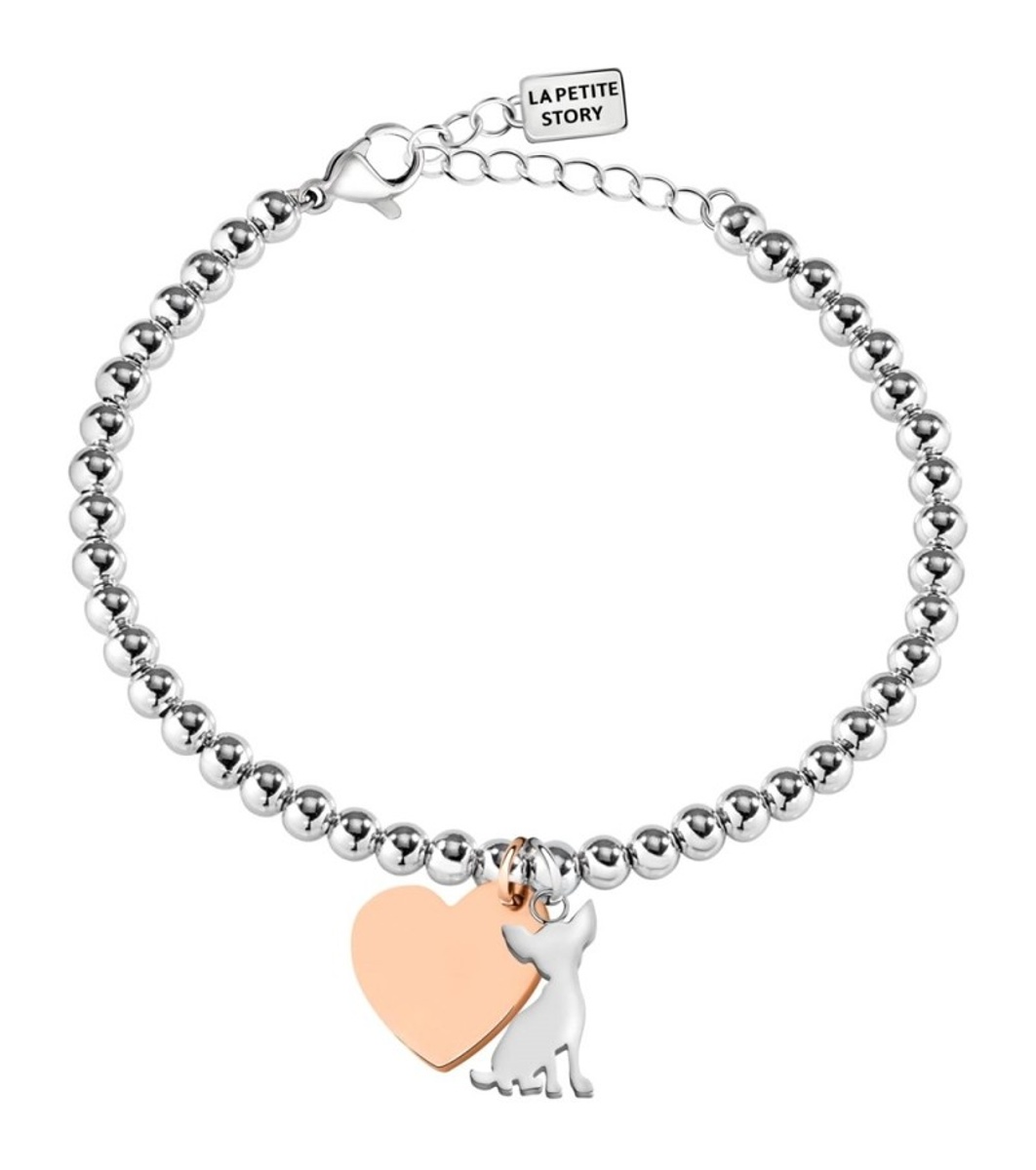 Brățară elegantă cu elemente decorative, inclusiv un pandantiv cu câine mic și inimă.