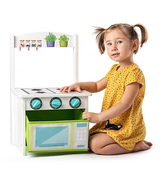 Cu această bucătărie din lemn, copiii se vor putea simți adevărați bucătari în timp ce se joacă. Când obosesc sau joacă un alt joc, este un scaun confortabil pe care să stea copiii. Acesta este un cadou grozav pentru cei mici.