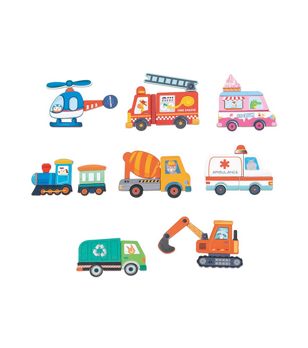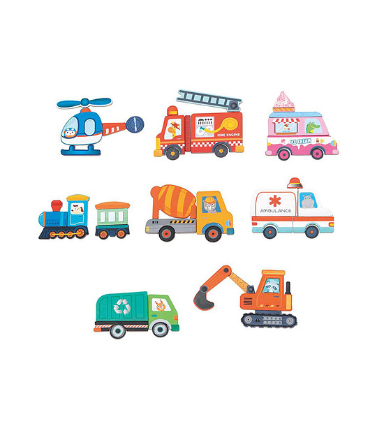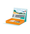 Într-o cutie convenabilă cu mâner cu închidere magnetică, care atunci când este deschisă se transformă într-un câmp de joc magnetic, vei găsi cărți de vehicule și forme magnetice pentru a repeta modelele de pe cărți sau pentru a crea modele unice pentru copii.