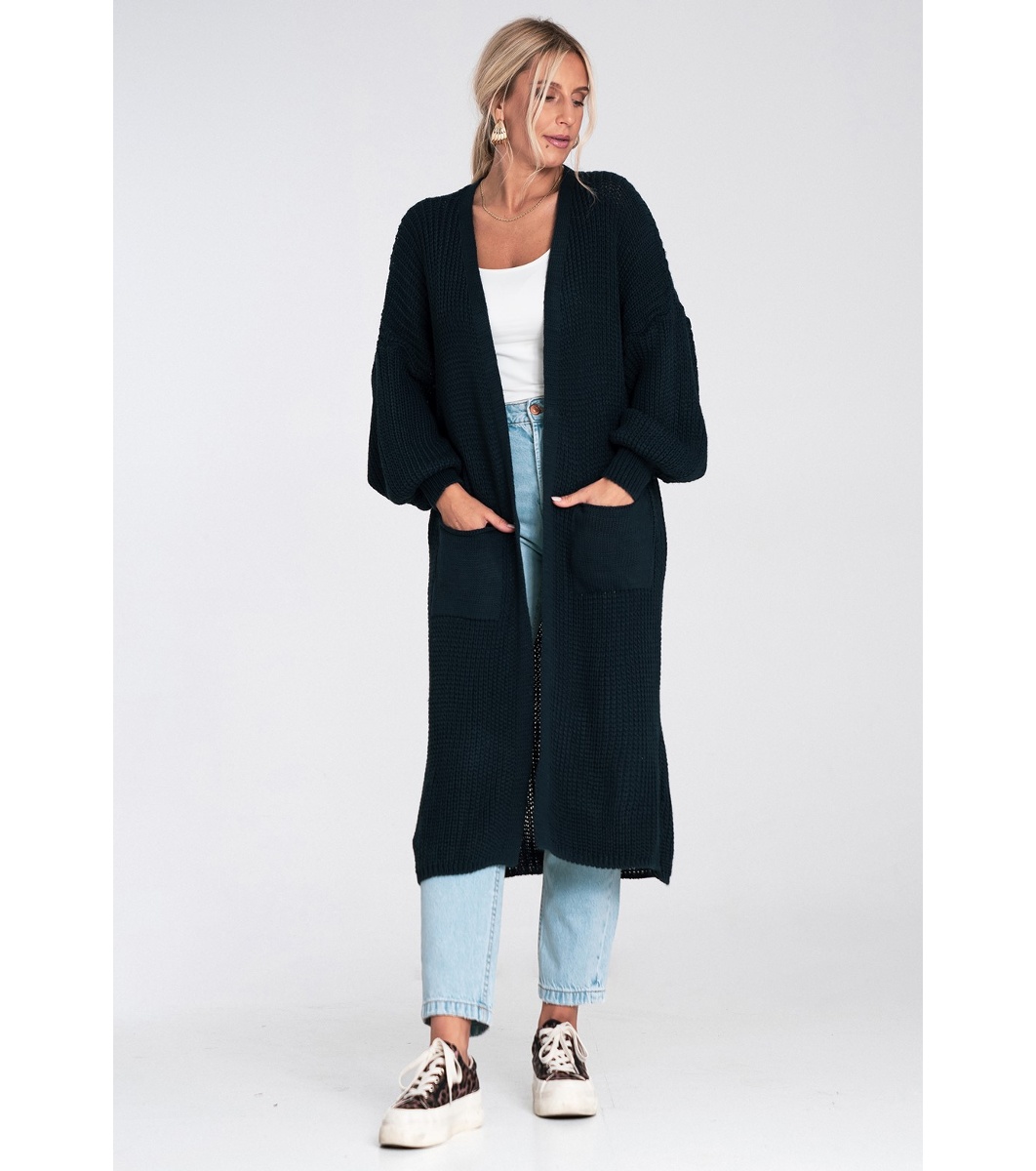 Figl Cardigan lung de damă, bleumarin Cardigan lung și drept, cu buzunare frontale practice.
