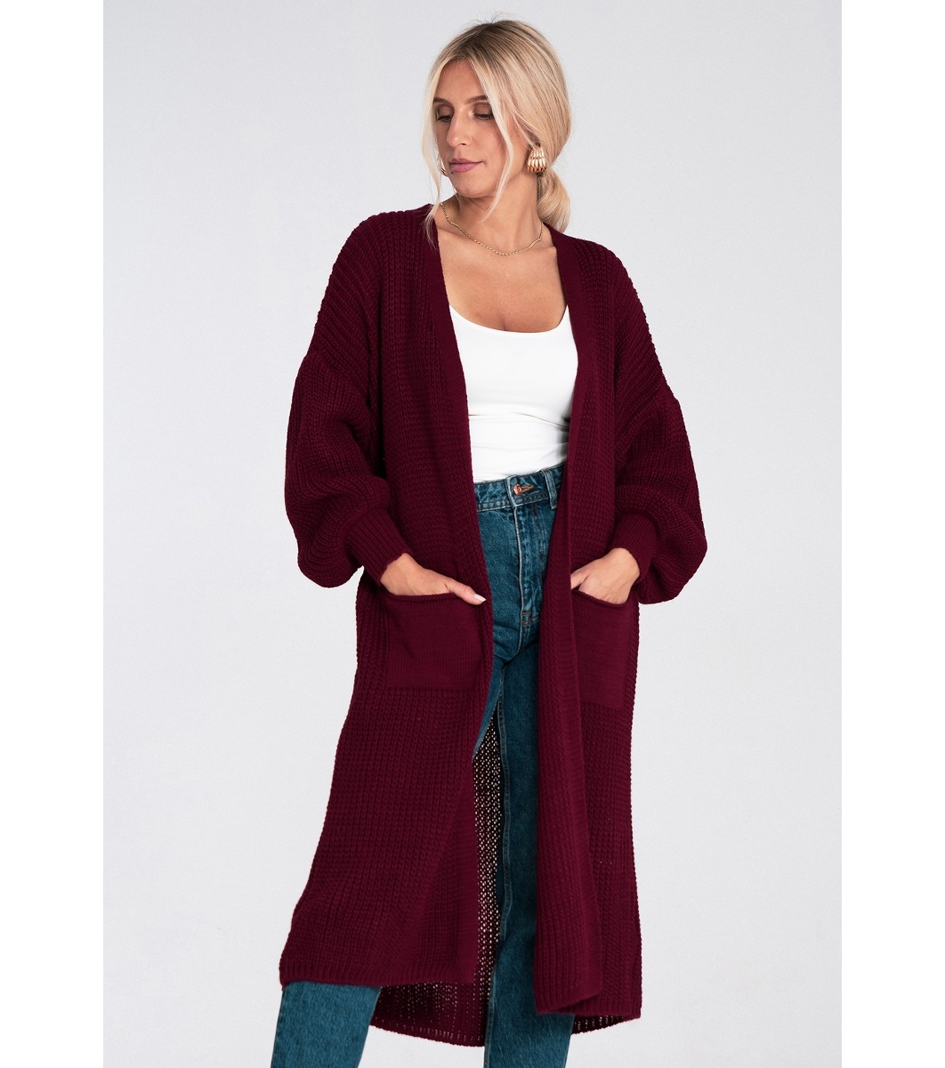 Figl Cardigan lung de damă, culoare vișinie Cardigan lung și drept, cu buzunare practice în față.