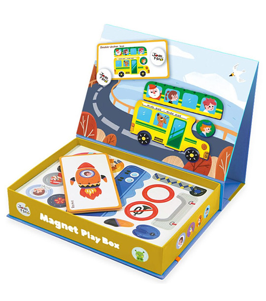 Setul include 10 cărți diferite cu imagini colorate cu diferite vehicule - de la mașini, autobuze și camioane, la nave, avioane și trenuri. Fiecare carte prezintă o scenă cu un anumit vehicul, iar sarcina copilului este de a aranja piesele magnetice corecte pe suprafața magnetică pentru a asambla imaginea. Acest lucru susține gândirea logică, concentrarea și abilitățile motorii fine. Pur și simplu alege cartea pe care dorești să o creezi, așează-o pe covoraș și începe să cauți magneții potriviți. Ușor, captivant și, cel mai important - extrem de distractiv! Cartea magnetică are un design convenabil de valiză, ceea ce o face extrem de practică pentru călătorii, depozitare și organizare.