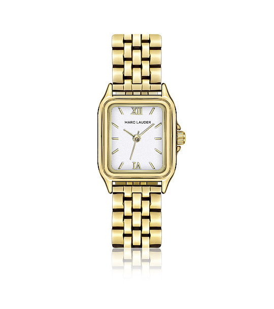 Marc Lauder Ceas Antwerp auriu cu lanț Ceas de damă cu cuarț, cu carcasă dreptunghiulară și lanț metalic de culoare aurie.